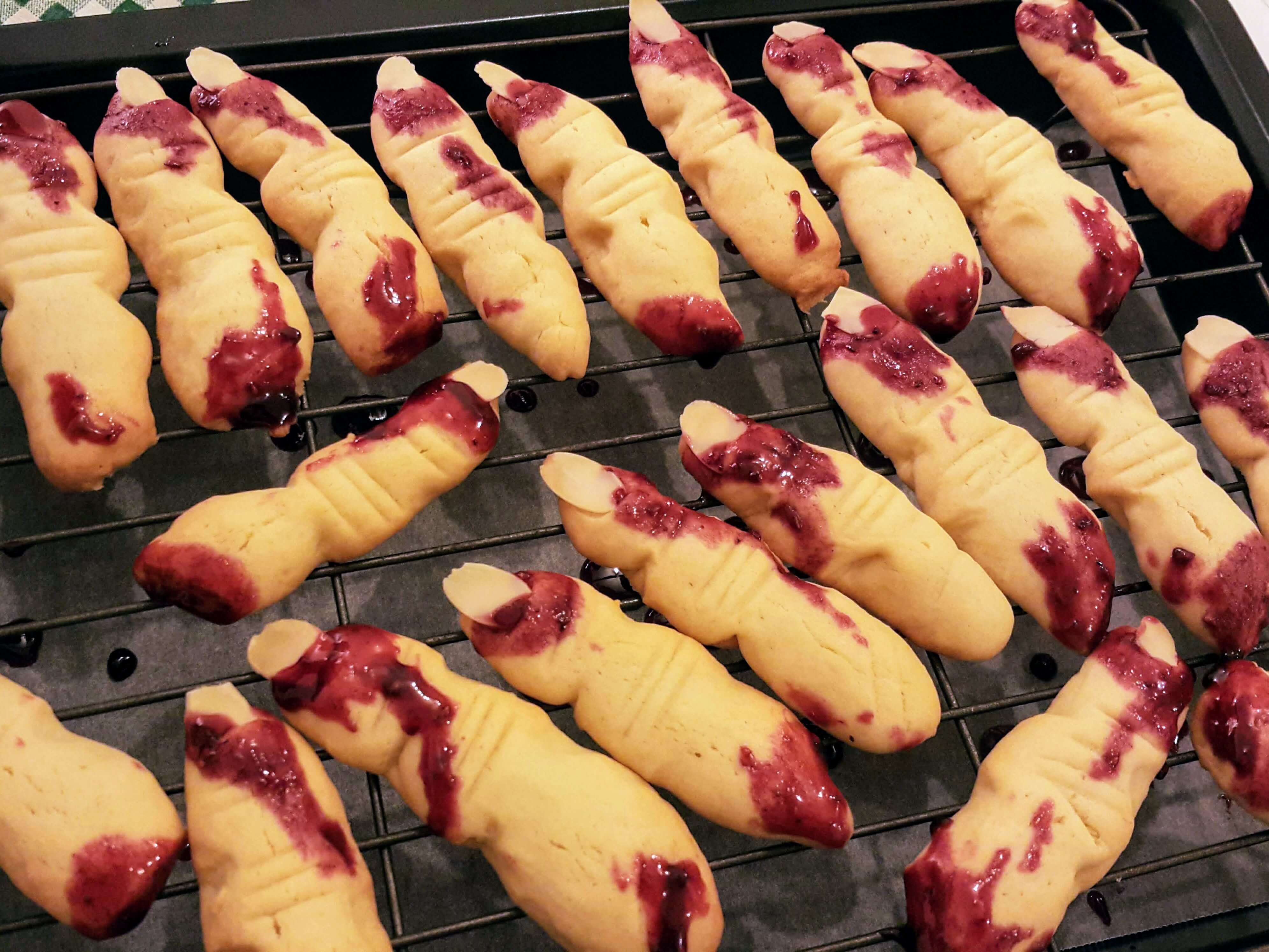 I used about 3/4 tbsp of dough per finger so I manage to make about 52 fingers. For the nails, I’ve used almond slices. Then finished off with some raspberry jam for a bloodied look.