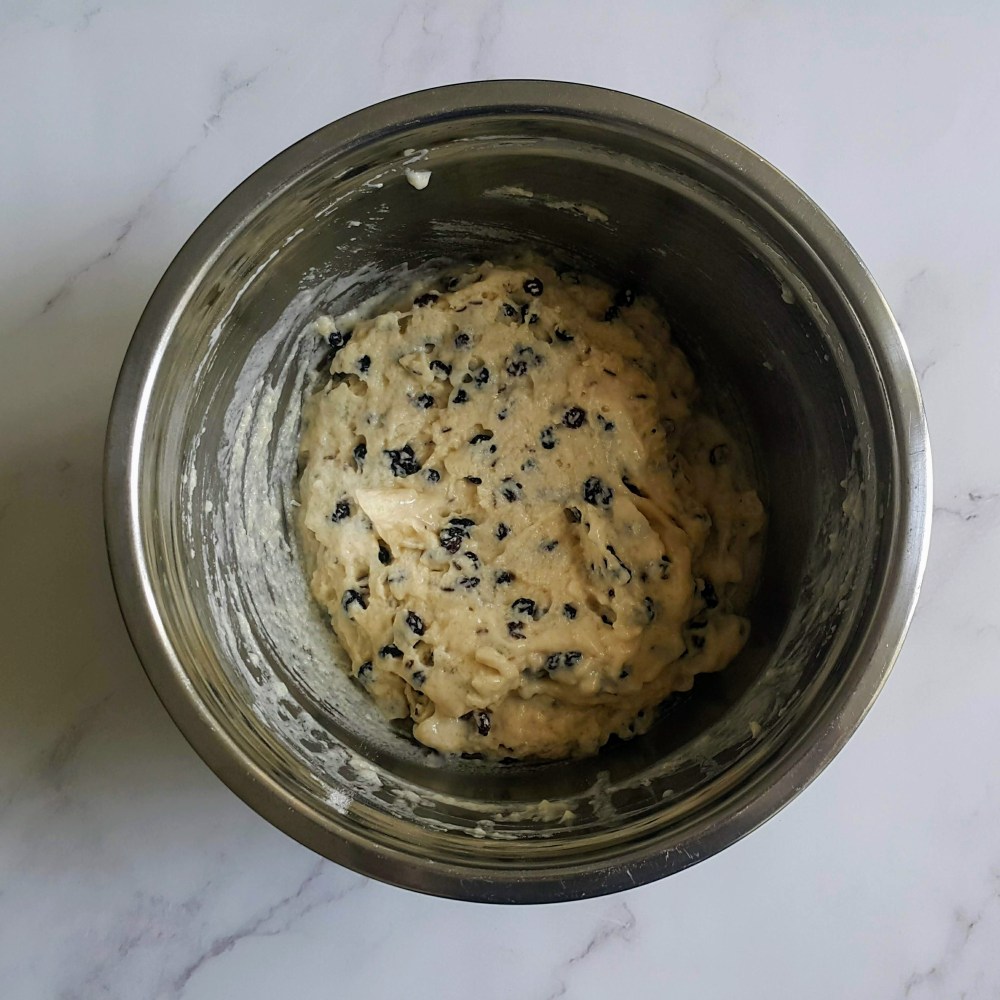 - In a bowl, combine flour, baking powder, baking soda, salt, sugar, currants and caraway seeds – the dry ingredients.