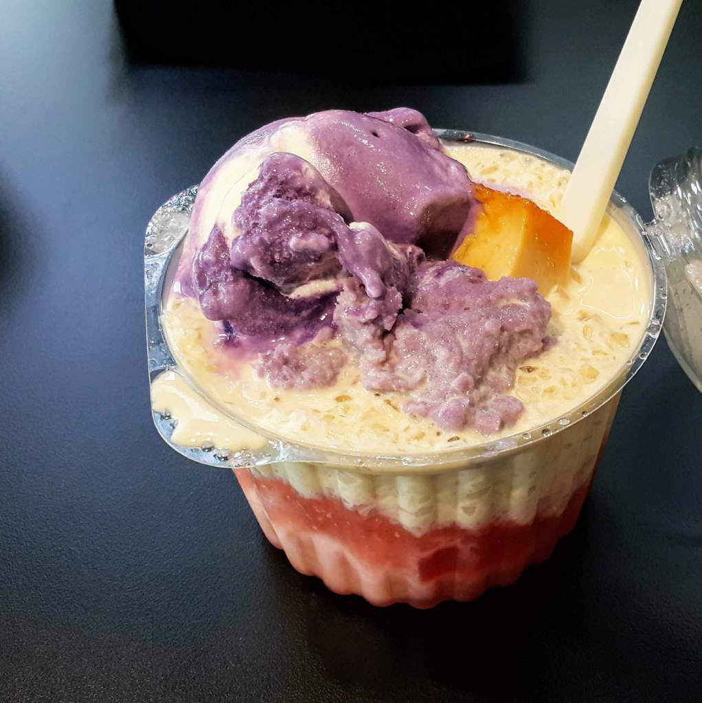 - This is a concoction of crushed ice, evaporated milk, and various ingredients like bananas, jelly, beans, ube ice cream etc. A famous Filipino dessert. It is very similar to Malaysian ABC. This is the ultimate treat in a hot summer day or any hot day. They are delightfully sweet and satisfying. My brother said it could do with more toppings but I loved it! However, I find it quite pricey. Having said that, it’s a 5/5 stars from me!