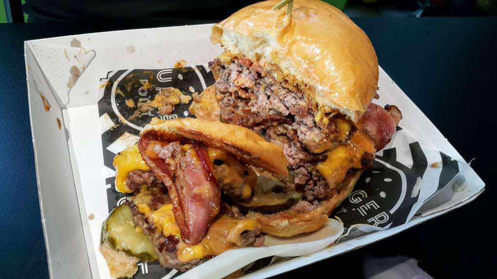 - This is a double beef patty burger, with double maple glazed bacon, double American cheese, BP sauce and house pickles. When it first arrived on the table, all I can say is HUGE! Well, we’ve paid $18 for this so quite happy with the size. Then the smell, OMG! It’s like we’re in a BBQ event! Sooo good. This is a best dressed burger – oozing out sauce, strips of perfectly grilled sticky bacon nestled between two juicy and deliciously moist beef patties. What more can I say? It’s a perfect 5/5 from me.
