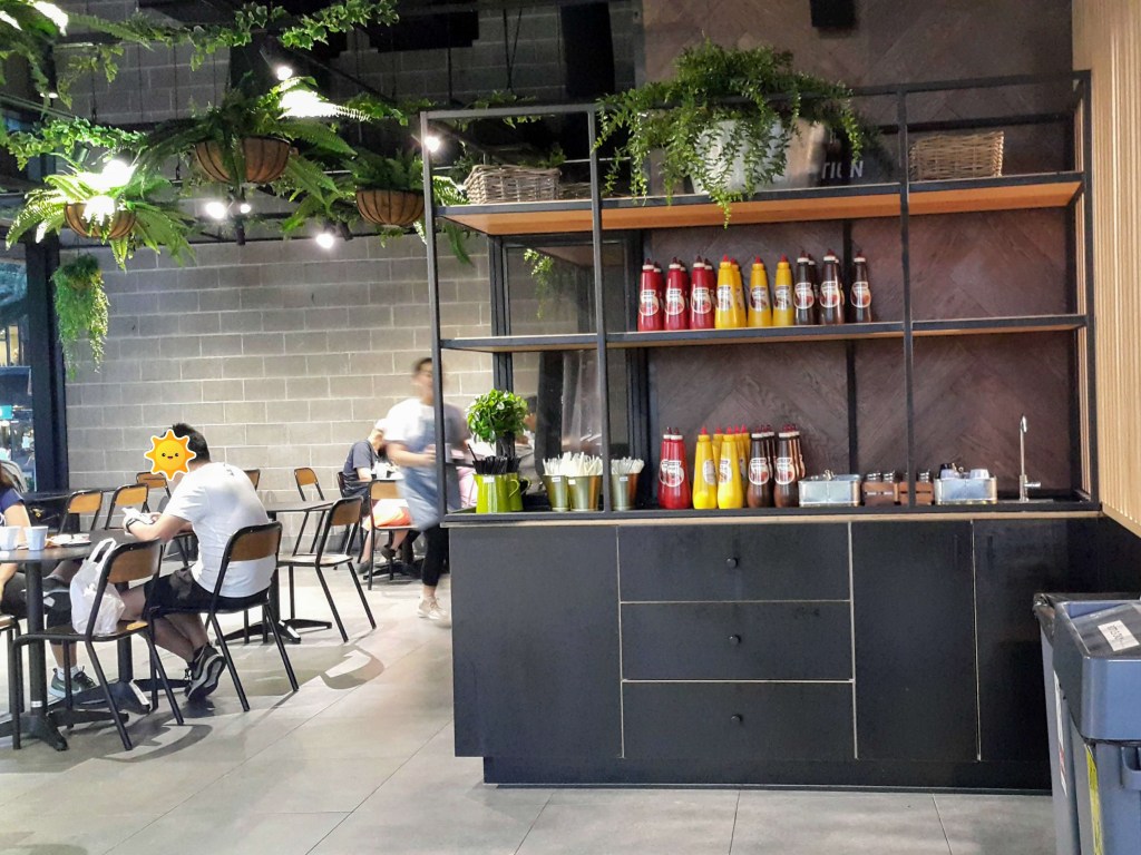 The restaurant is spacious, clean and comfortable. They have a designated area for water, cutlery and the sauces. Next to it is the hand wash area. No washroom but you can definitely use the one in the mall. The staff are also friendly and helpful.