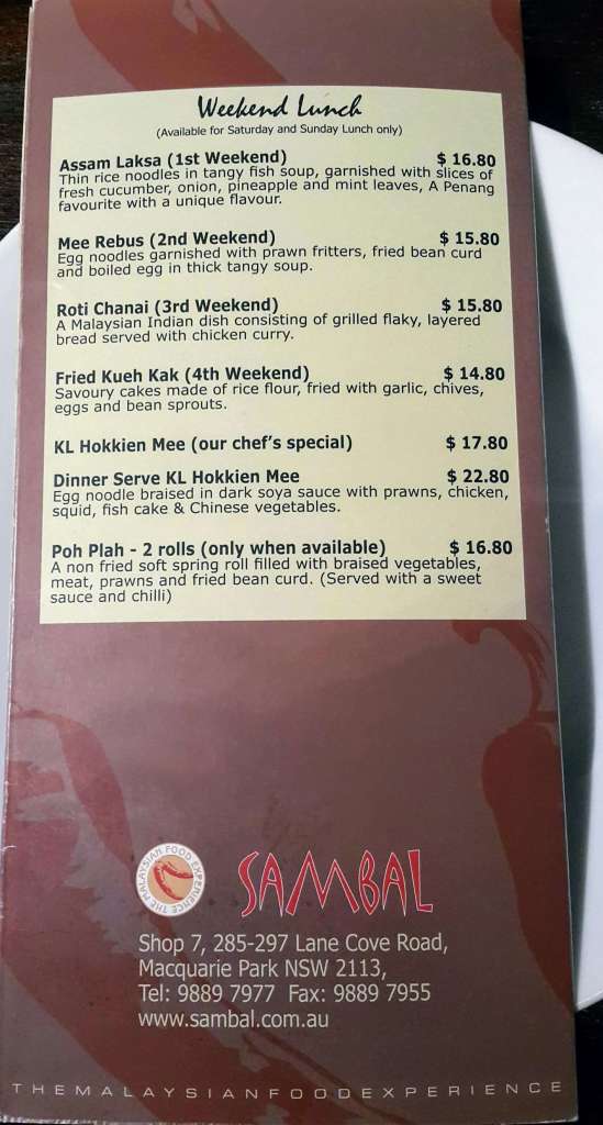 There are lots of restaurants that serve Malaysian food in Sydney, mostly Nyonya cuisine. I have been to a few – some good some, err..not so good. Last Saturday, we went to a restaurant called Sambal which is located at Lane Cove Road, North Ryde. The nearest station is Macquarie Park station. (Note: Do not be confused with The Sambal on Kent Street.)