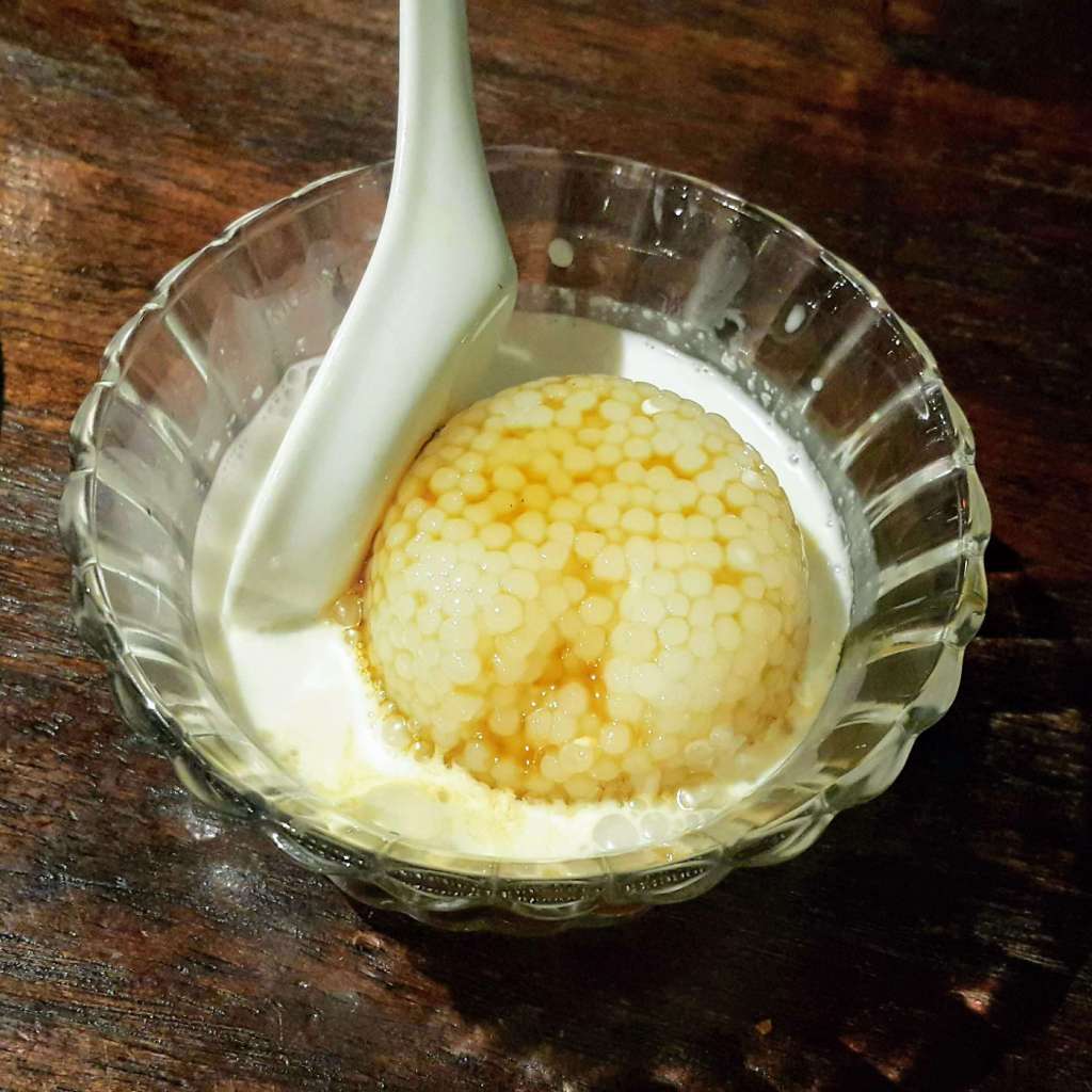 - Sago pearls served in coconut milk and covered with gula melaka syrup. Simple presentation, tasty but nothing special. We were a bit disappointed with the portion – very small for the price point. With that, we give it a 3 stars.