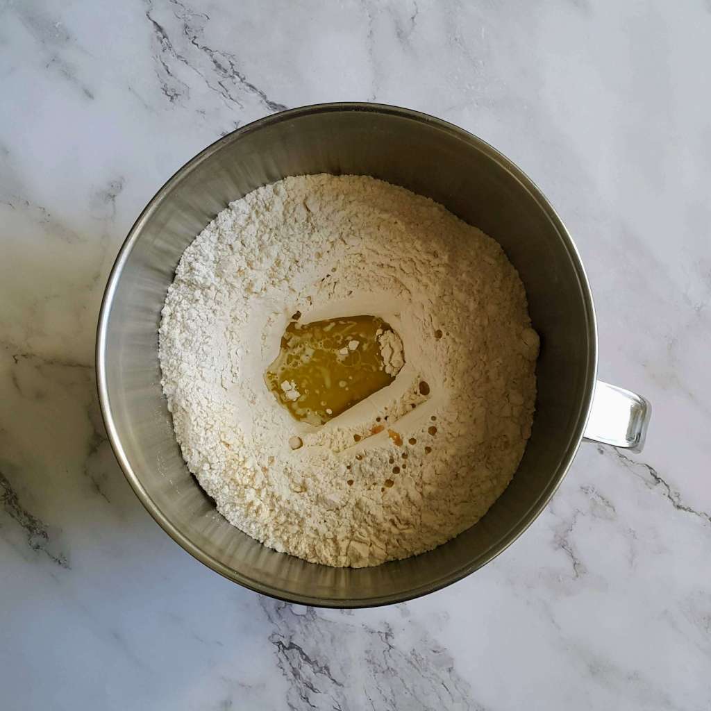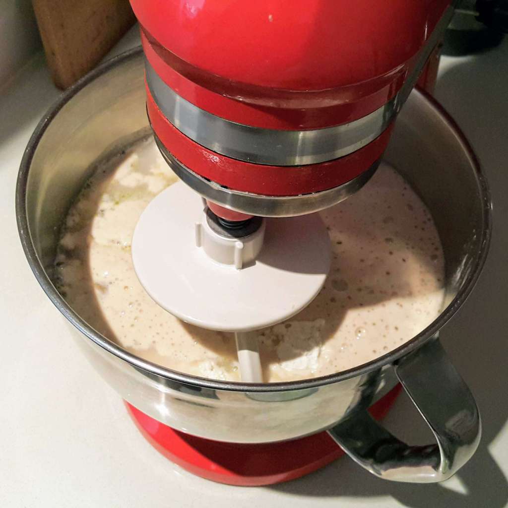 - Put the remaining bread flour, salt, water, milk, olive oil, and honey into your mixing bowl. Then pour in the yeast mixture, turn on the mixer and mix with a dough hook until a smooth dough is formed. (note 2)