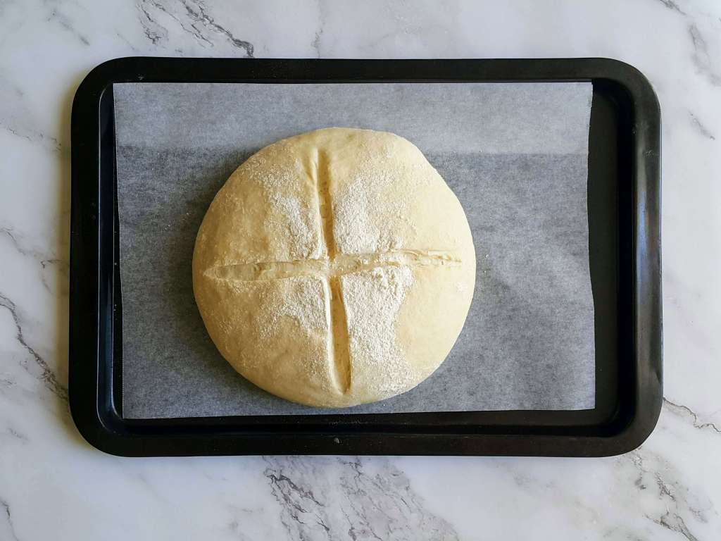 - Preheat the oven at 220 degree celsius. Tip the loaf out to a baking tray lined with baking paper. Slash the top of the loaf in few places with a serrated knife.
