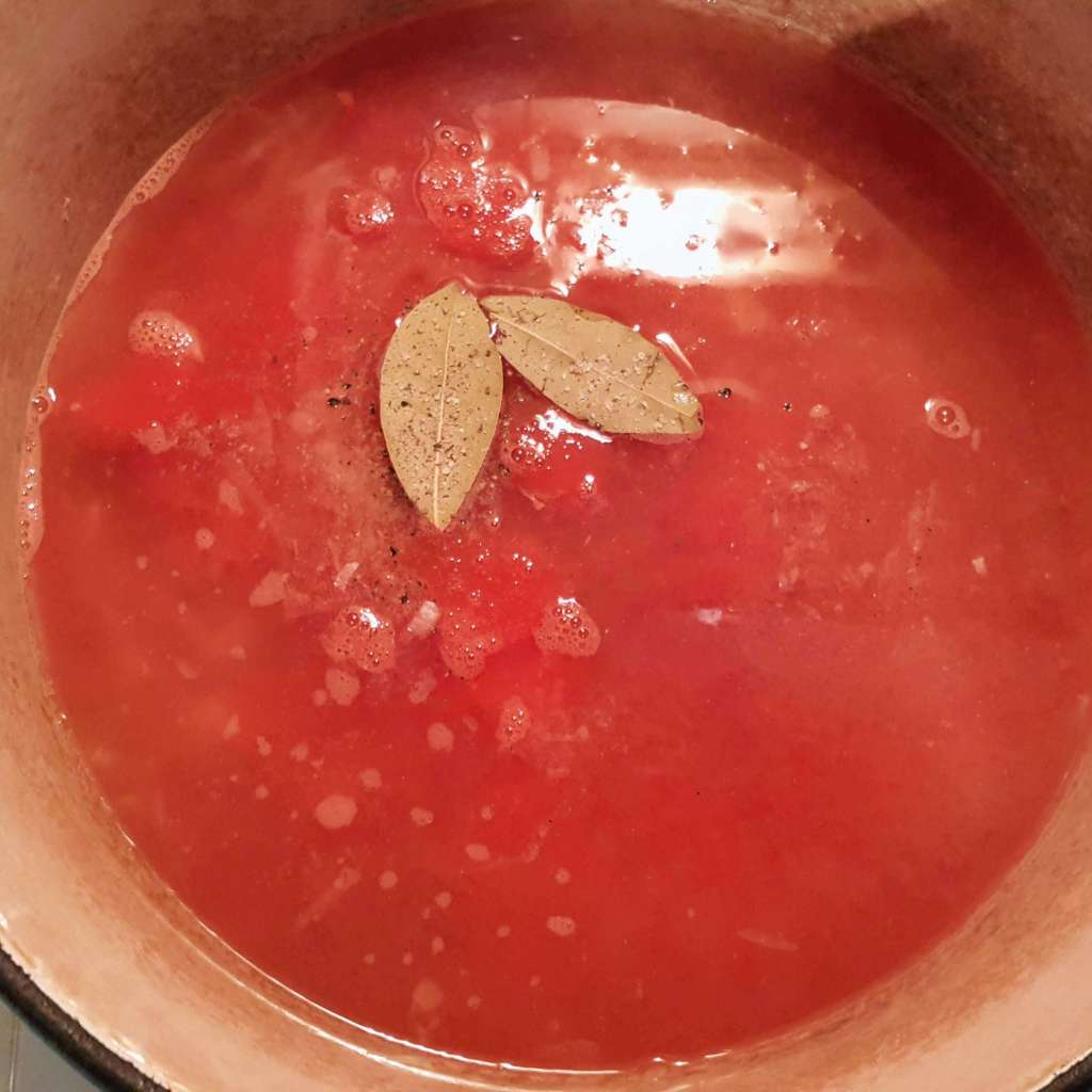 4. Add water, tomatoes, bay leaves, sugar, salt & pepper