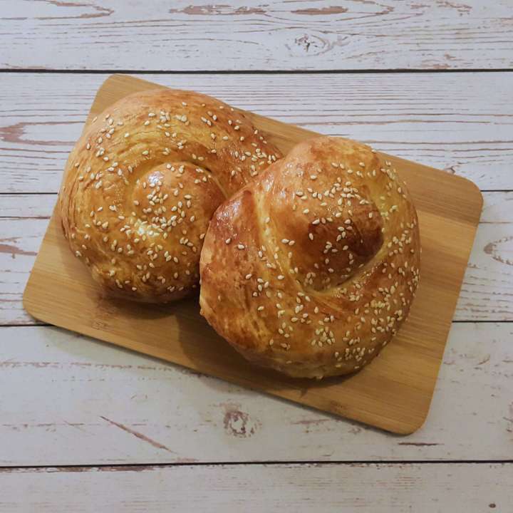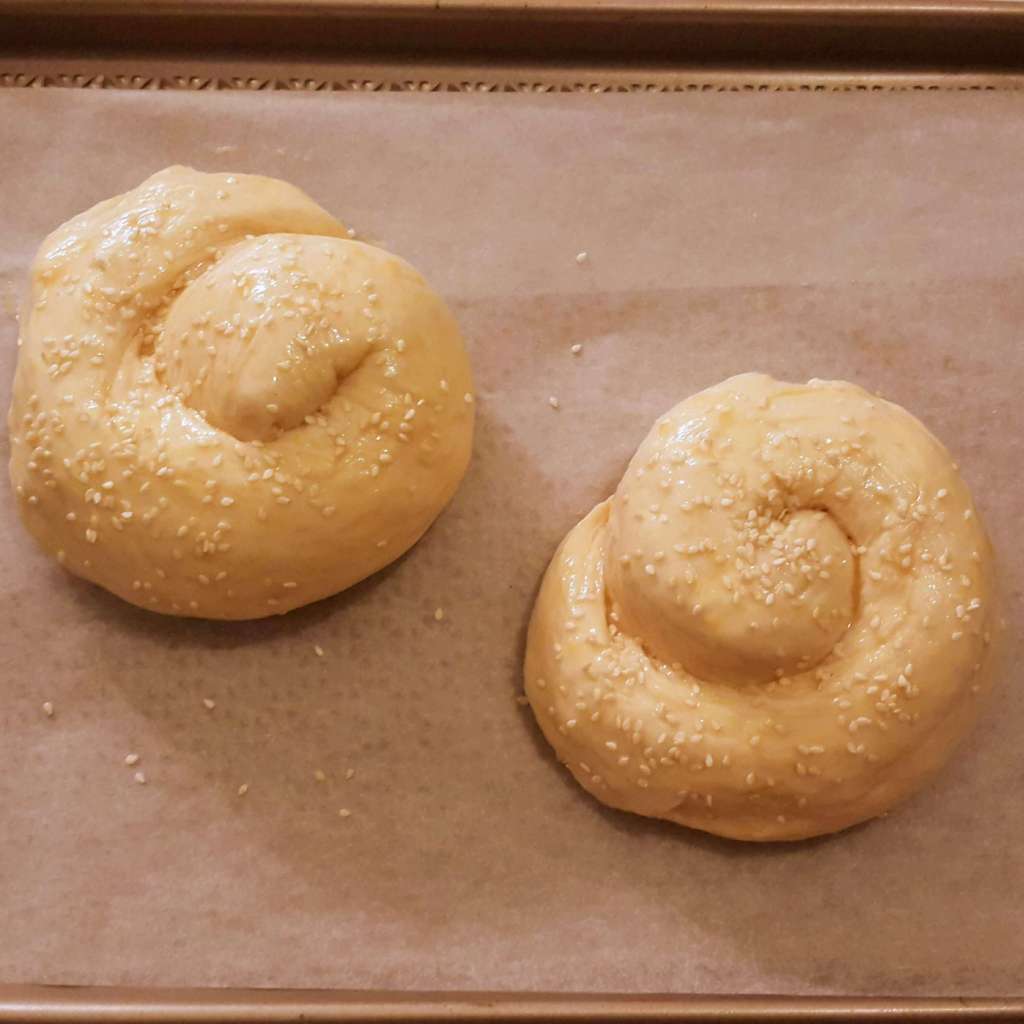 - Leave the dough to proof until double in volume, about 40 mins. Preheat the oven to 200 degree Celsius. Beat the egg yolk with 1 tsp of water. Brush the top of the dough with egg yolk mixture and sprinkle with the sesame seeds.