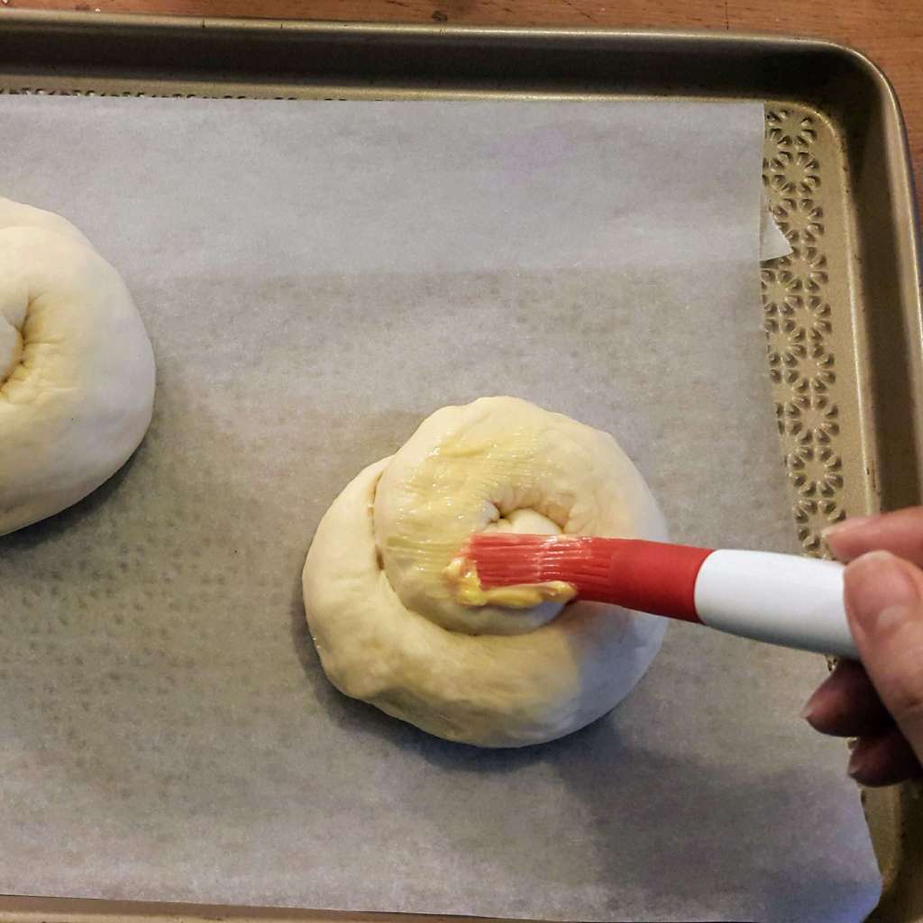 - Place the snail like shaped dough onto a baking tray lined with baking paper. Brush the dough with melted butter.