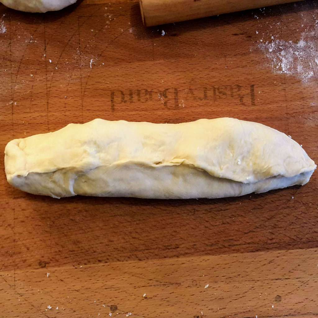 - Take one dough and roll it to a rectangular shape. Place a quarter of the feta cheese along the center of the rolled dough. Fold the dough to cover the cheese. Pinch the edges together to form a long roll. Repeat with the rest of the dough.