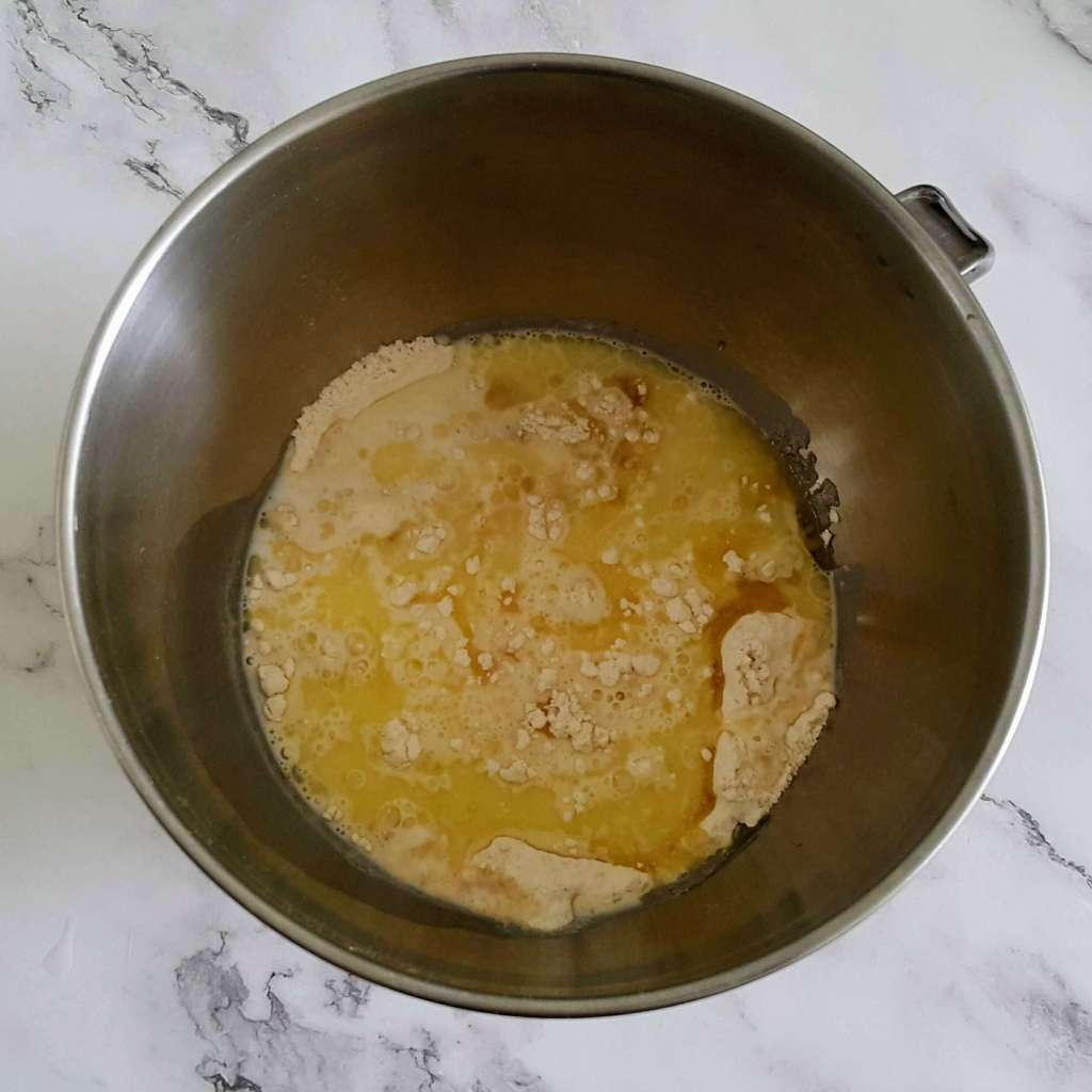 - Make a well in the center of the dry ingredients, add in the olive oil, honey, egg white and milk. If using fresh yeast, add in the paste into the dry ingredients. Using a hook attachment, mix into a soft dough, about 15 mins. Remember to test the dough using the windowpane test. Shape the dough into a ball.