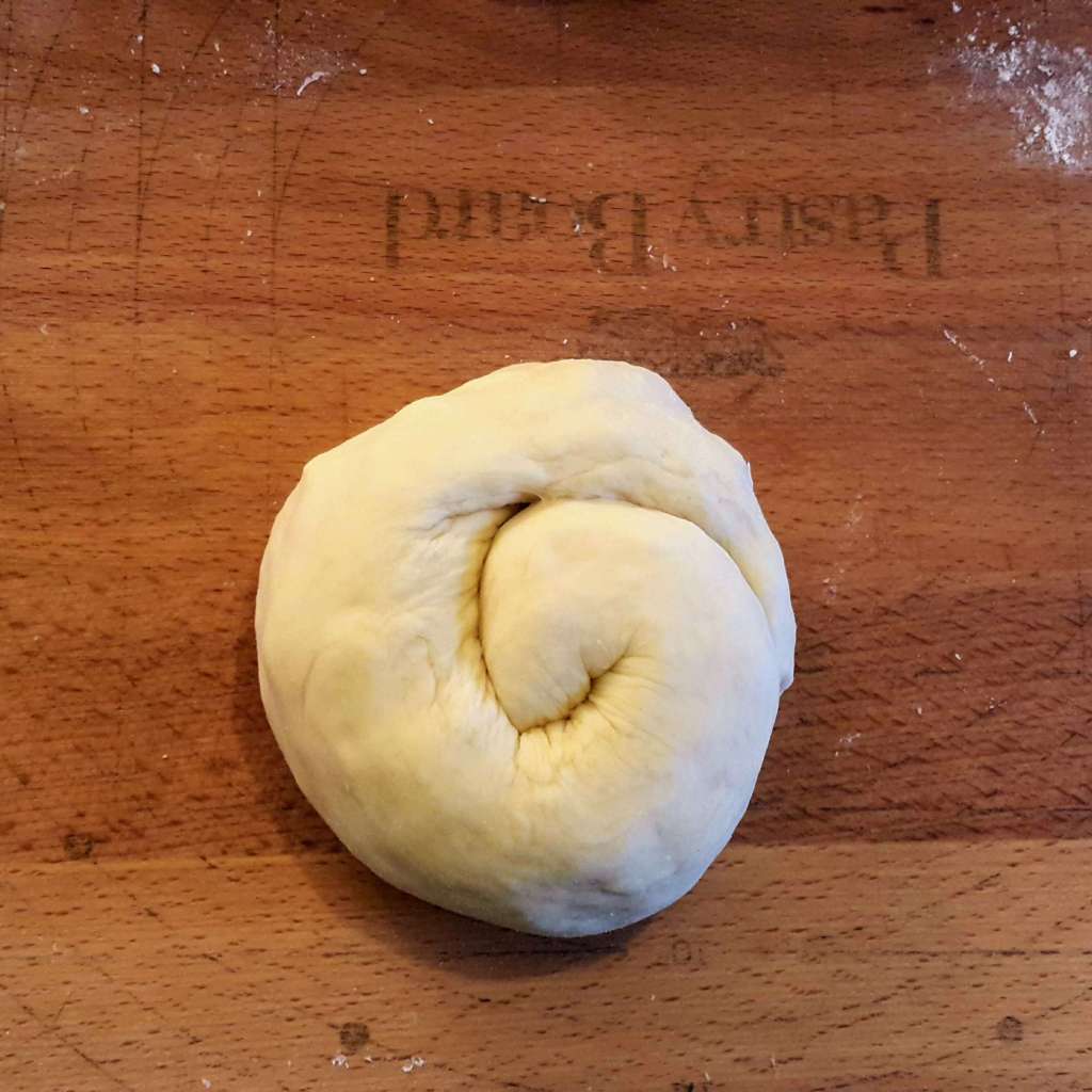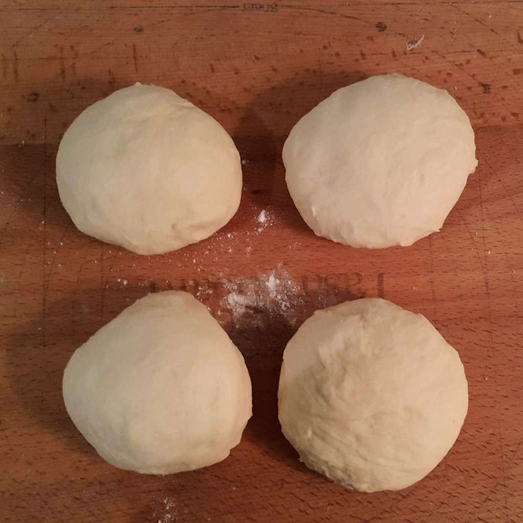 - After it has double in size, tip the dough out to a pastry board and knead for a few seconds. Cut the dough into 4 pieces and shape it to a ball.