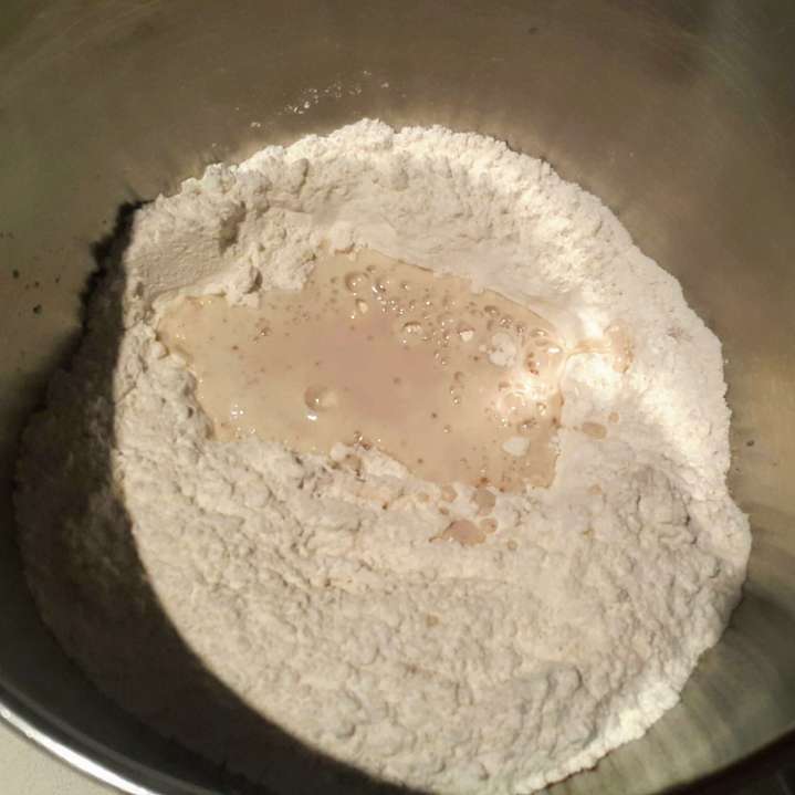- Into the mixing bowl, combine the flours, milk, yeast, salt and sugar. Turn on the mixer, slowly add in water and mix to a sticky dough. Add in the egg and butter and continue mixing.