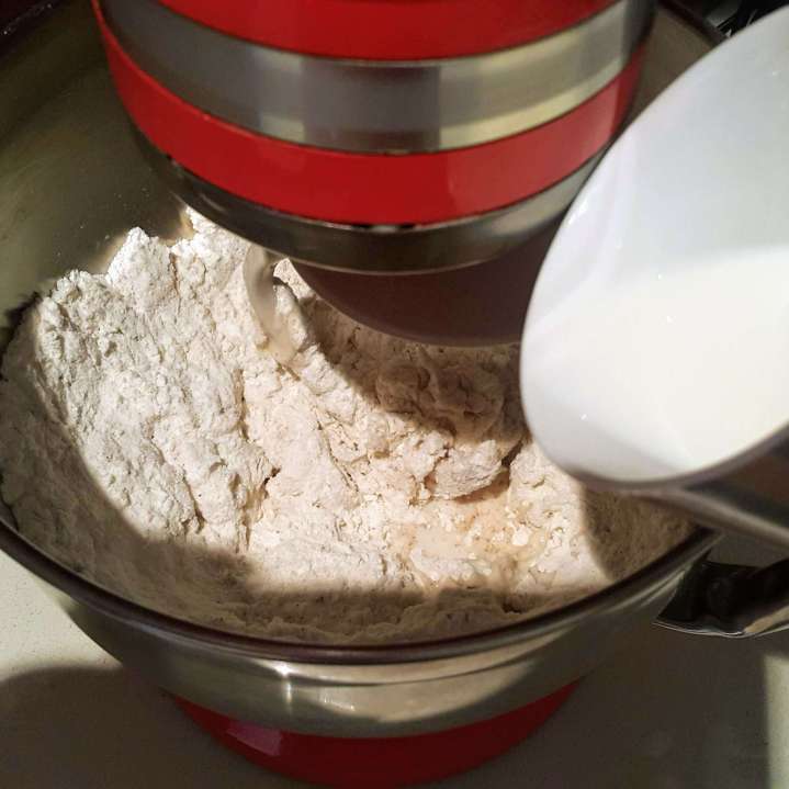 - Different types of flour absorb water differently so you might need to adjust the amount of water needed for the dough. Slowly add in water into the dry mixture and knead until the dough comes away from your mixer bowl.