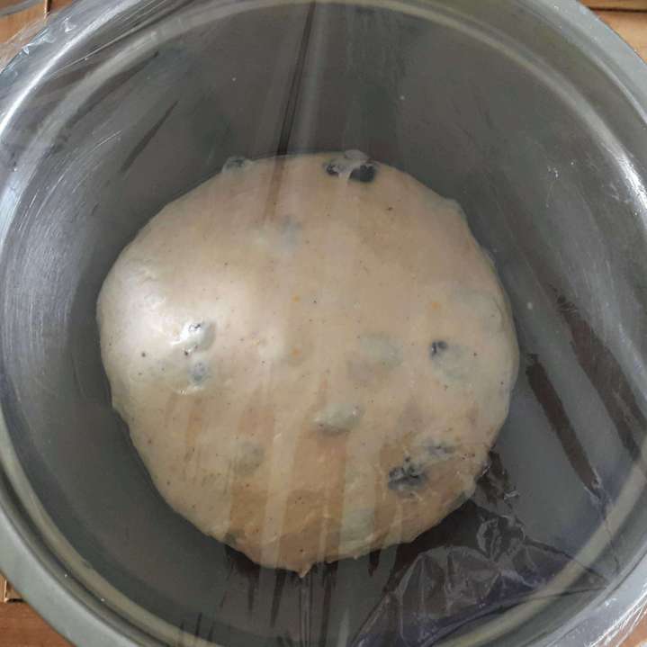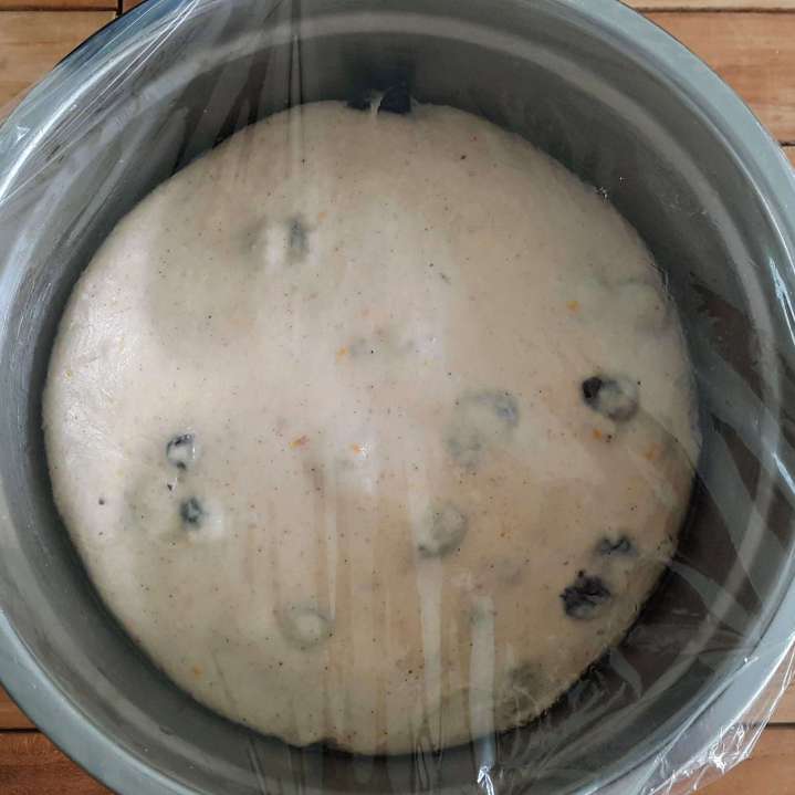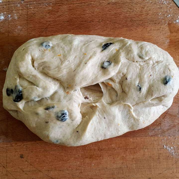 - Add the dried fruits, orange zest and mixed spice and continue mixing on low speed until silky and smooth. Ensure the dough pass the window pane test.