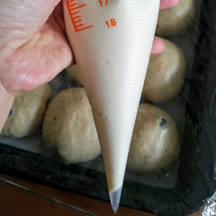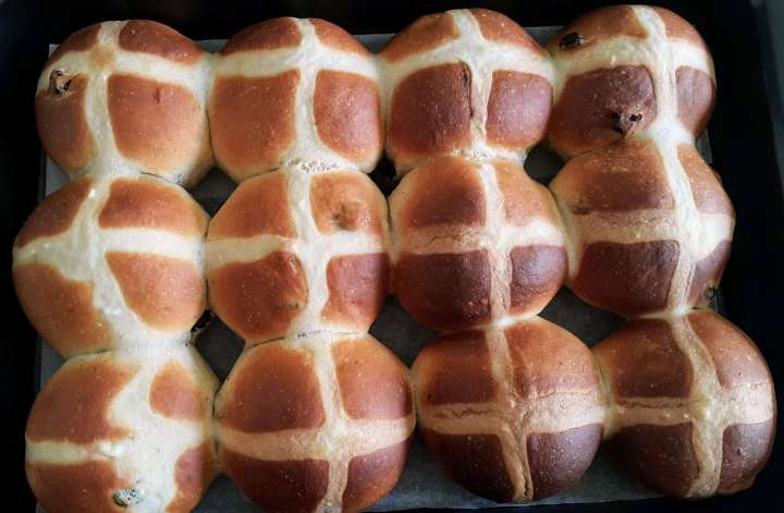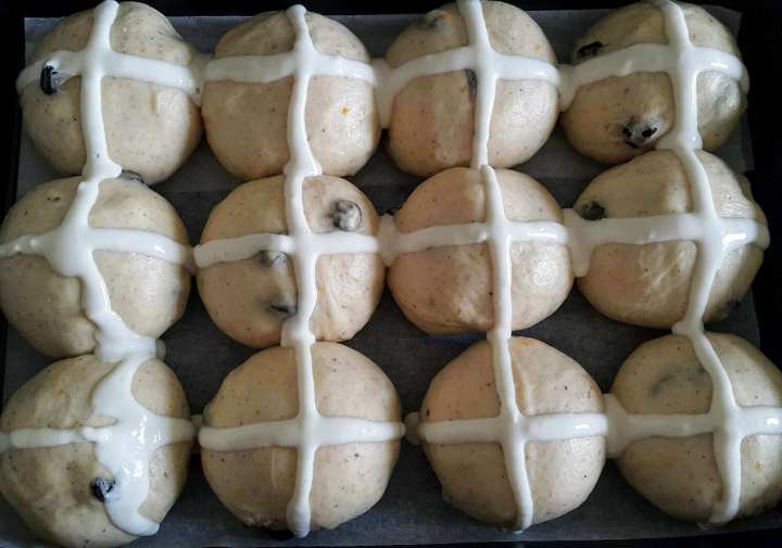 - Pipe a cross on top of each bun, then bake them in the oven for 15-20 mins or until golden.