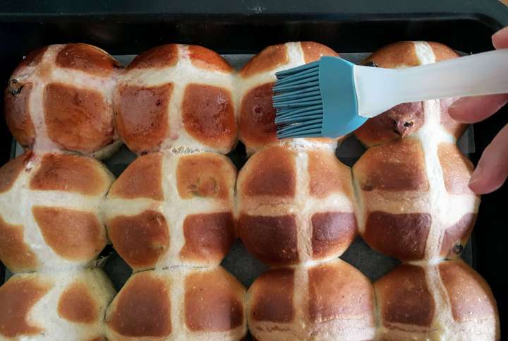 - Meanwhile, mix the jam and water. Brush over the buns to glaze as you take the buns out from the oven.