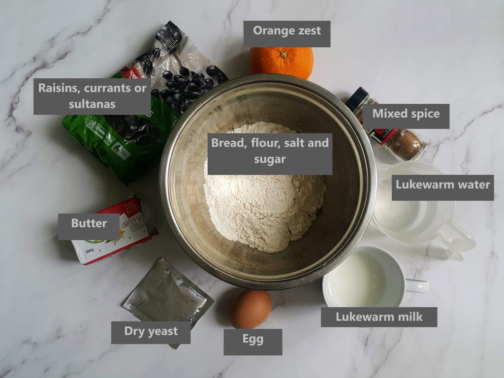 This recipe makes about 16 buns. Leave out the crosses if it isn’t Easter. So let’s get started.