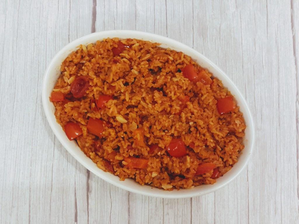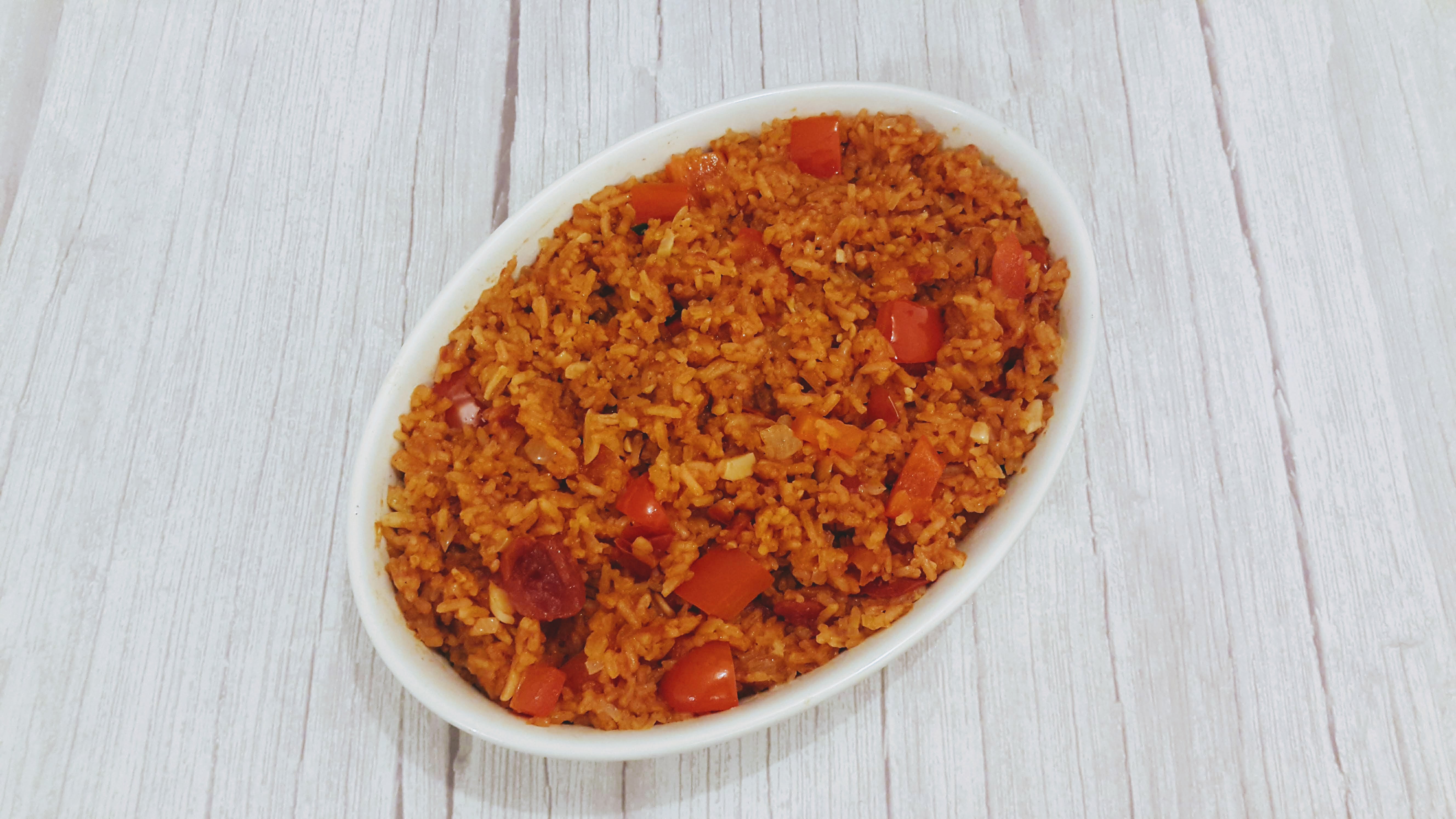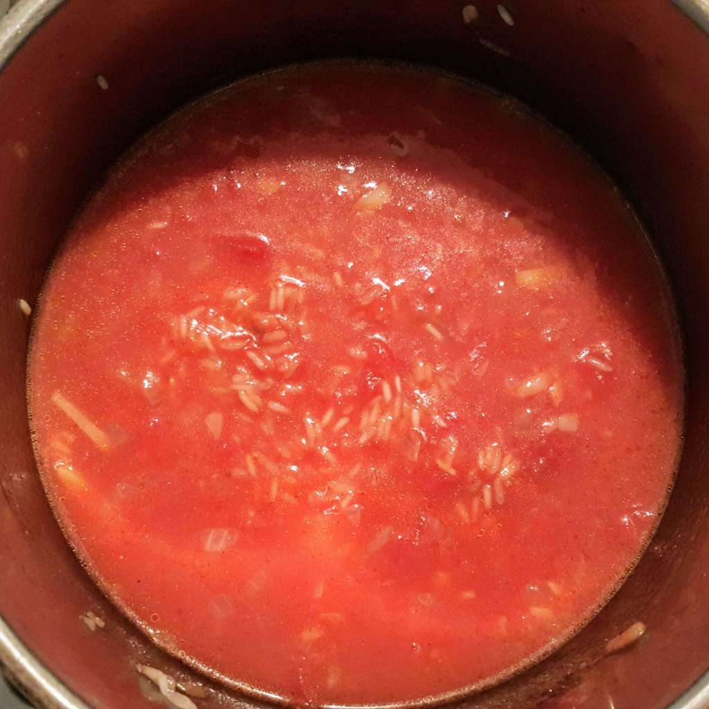 - Add the salt, sugar, spices, tomatoes, tomato paste, and stock. If you don’t have stock, just add in water and a vegetable stock cube, like I did. Mix well, cover and increase the heat to high, bring to a boil. Then reduce the heat and simmer for 20 mins. Check to ensure the rice is cooked through.