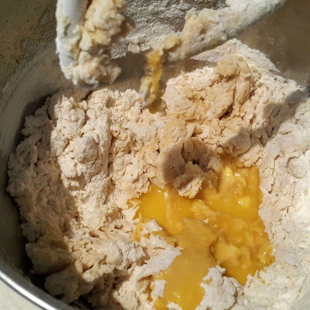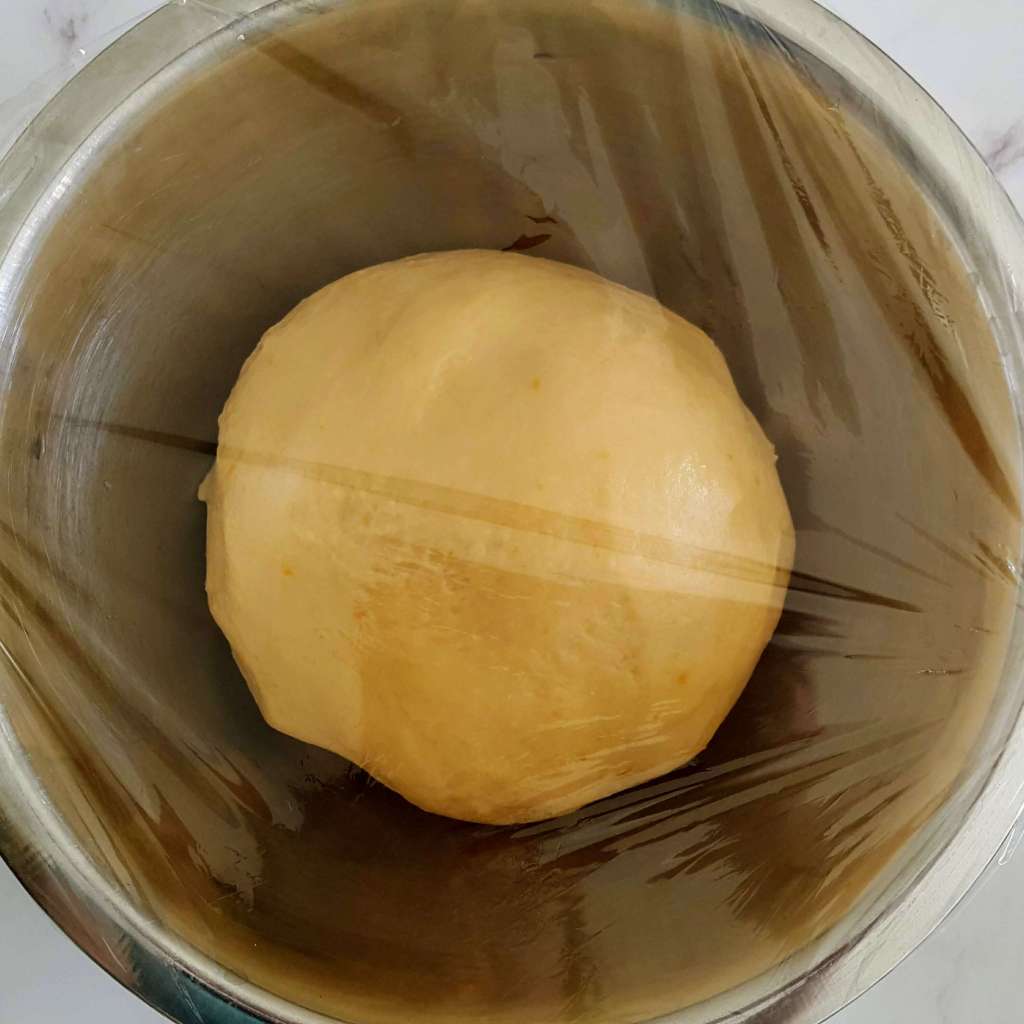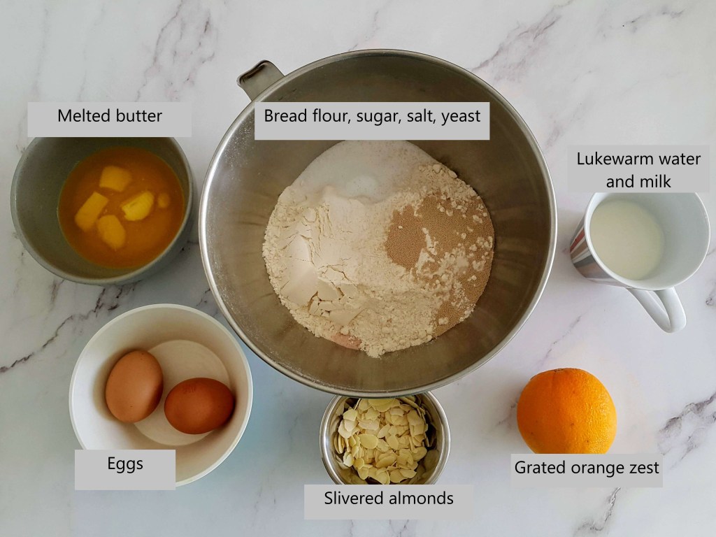 - Into the mixing bowl, combine the bread flour, milk, water, yeast, salt, sugar grated orange zest and lightly beaten eggs. Turn on the mixer to slightly combine the ingredients. Then add in melted butter and continue kneading until it forms a soft dough. If you find that your dough is a bit dry, try add in water a tablespoon at a time until the dough is soft and smooth.