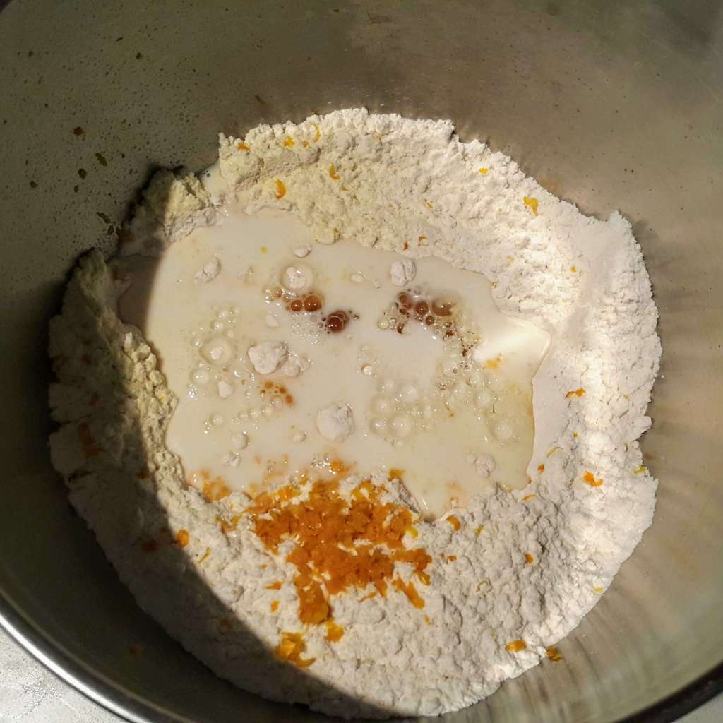 1. Combine flour, salt, sugar, yeast, milk, water and orange zest