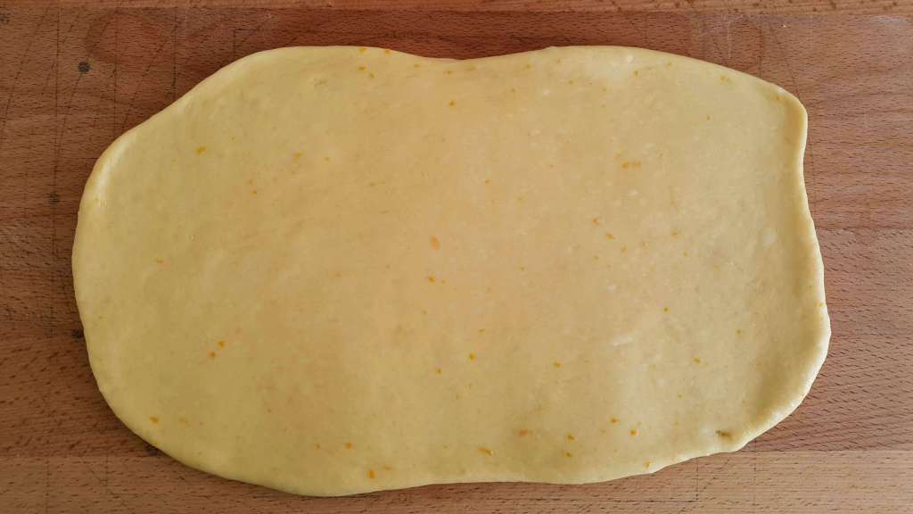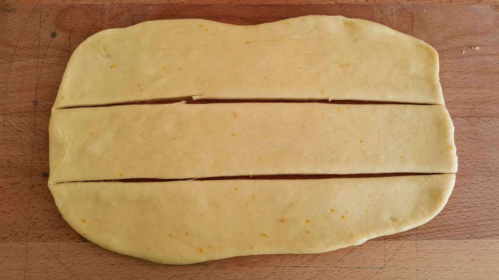 - After it has double in size, tip the dough out on a board and divide the dough in half (~435g each) and roll out each piece into roughly a 15cmx30cm rectangular. Then cut each rectangular width wise into 3 strips.