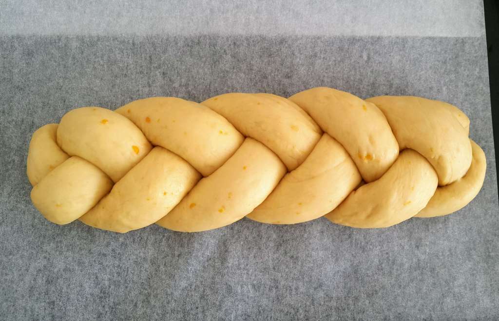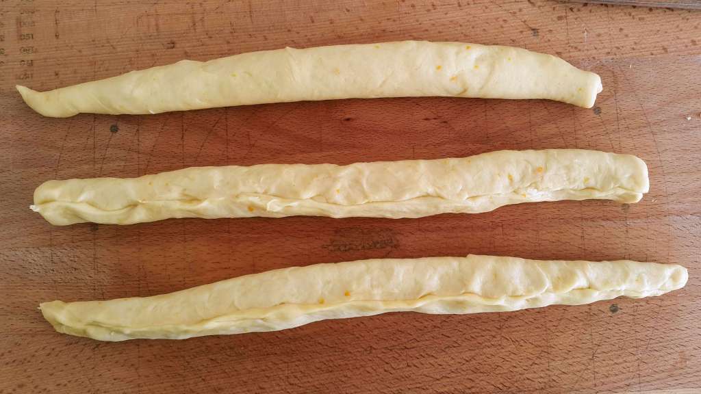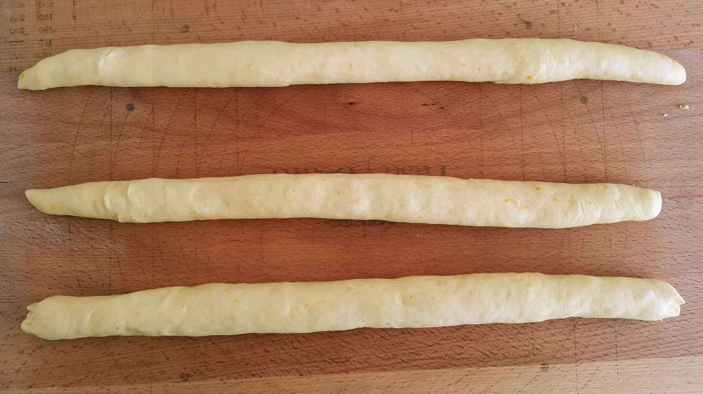 - Lay 3 ropes next to each other and start braiding, pressing the end to seal. Tuck both ends underneath the braided dough and transfer them to a baking tray lined with baking paper. Cover and let them rise for about 20 mins or until they are double in size. In the meantime, preheat the oven at 180 degree Celsius.