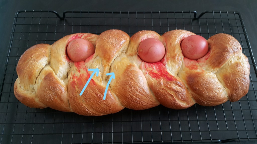 - To get a smooth braided loaf, make sure you don’t braid them too tightly. The tightness of the braiding will result in a “burst” in the middle of the loaf. Like the photo below.