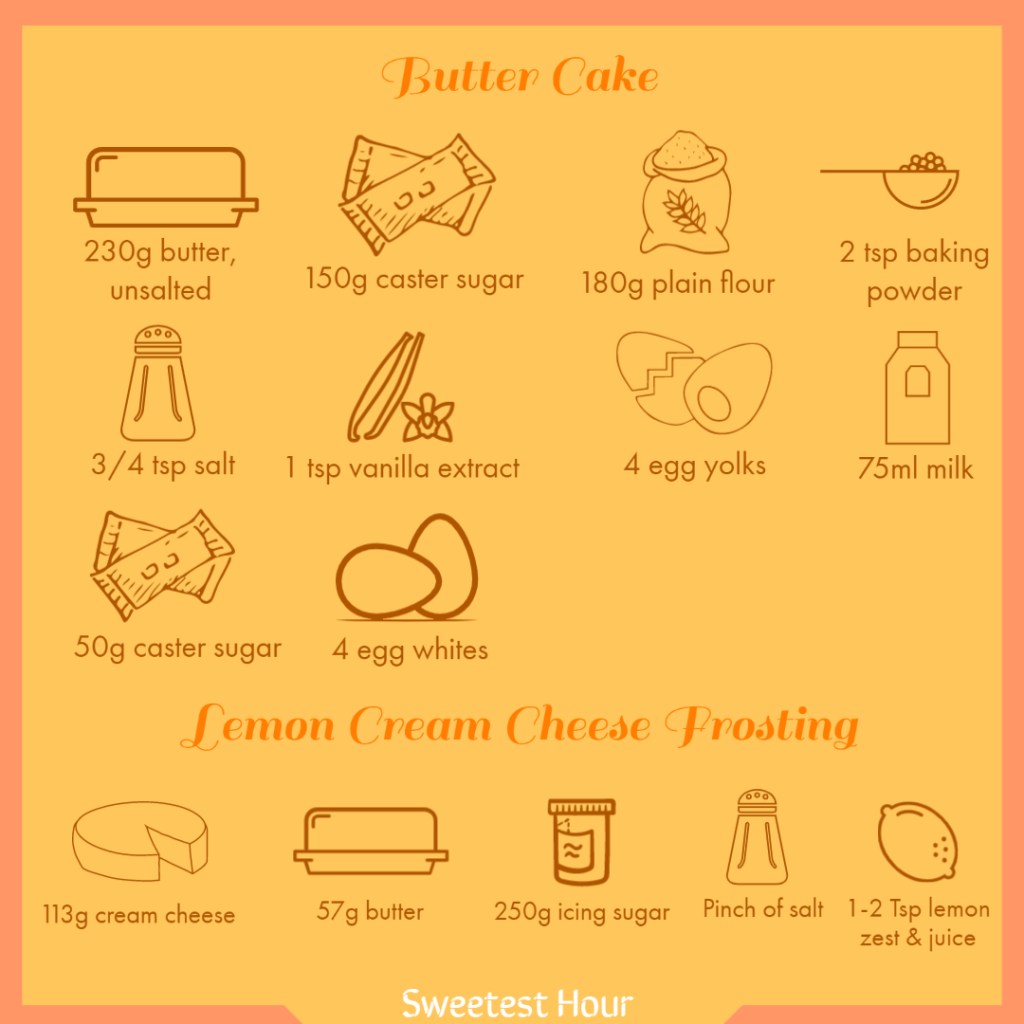 I have been looking for a good recipe for butter cake for quite a while now. I’ve tried a lot of butter cake recipes but still wasn’t able to recreate the taste and texture of the butter cake that I used to eat back home. Then one day, before Chinese New Year, I bumped across Mrs Ng Old Fashion Butter Cake recipe by Daily Cooking Quest. I made it and it was instantly a hit! It was the taste and texture I’ve been looking for. I then top it with a lemon cream cheese frosting to further elevate the cake. You can always add some lemon juice and turned it into a lemon butter cake and finished it off with the same lemon cream cheese frosting.